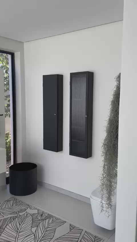 A refined balance of elegance and practicality, this mild steel vanity cabinet brings a calm architectural presence to the bathroom. Its tall, slender form is wall-mounted, creating a light and modern feel while offering generous vertical storage. Inside, adjustable shelves allow the cabinet to adapt easily to everyday essentials.